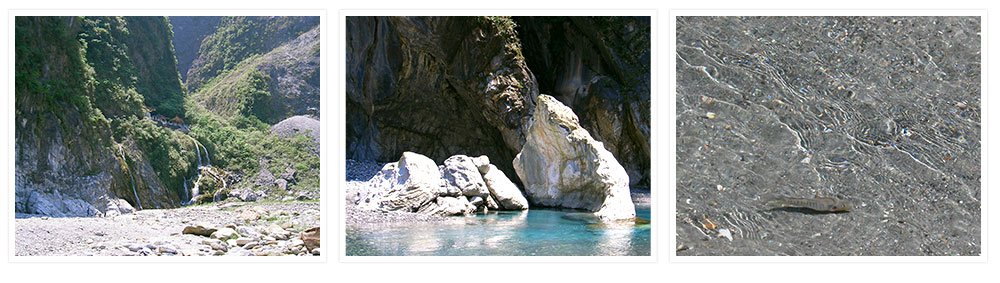 | 砂卡噹步道地形相當具有特色,溪水流經大理岩地區,溪水中的微酸溶解大理岩中碳酸鈣成分,因此溪水 常呈現藍綠色,岩石上有美麗的彎曲線條,與溪流、綠蔭相對,形成美 妙的水石畫,展現十足生命力。沙卡礑溪因含沙量少,所以終年清澈,有豐富的水生生物,適合作生 態觀察及親水的活動。四、五月和十、十一月這四個月份更是觀察螢火蟲的絕佳場所! |