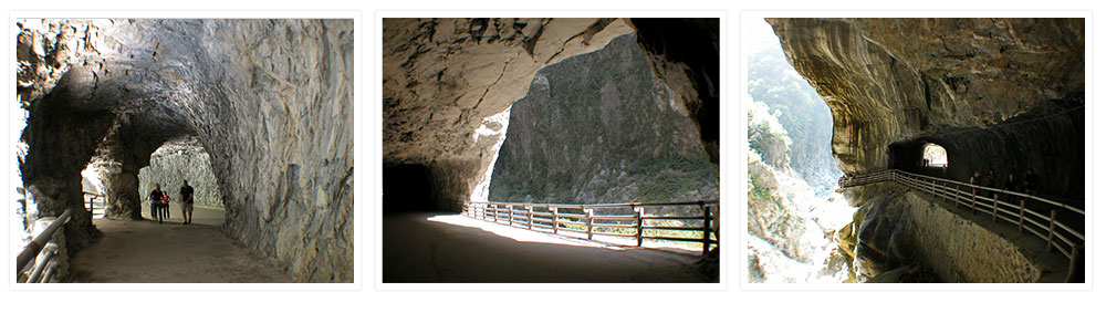 『九曲洞』隧道中橫公路最長的隧道全長1220公尺,亦是太魯閣峽谷最精華的路段,步道緊倚著高山深壑,向下俯瞰則是急湍的立霧溪水,兩岸山壁緊峙,大自然的鬼斧神工與險峻的地勢令人嘆為觀止。
